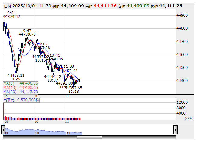 【市況】日経225先物:1日正午=540円安、4万4470円