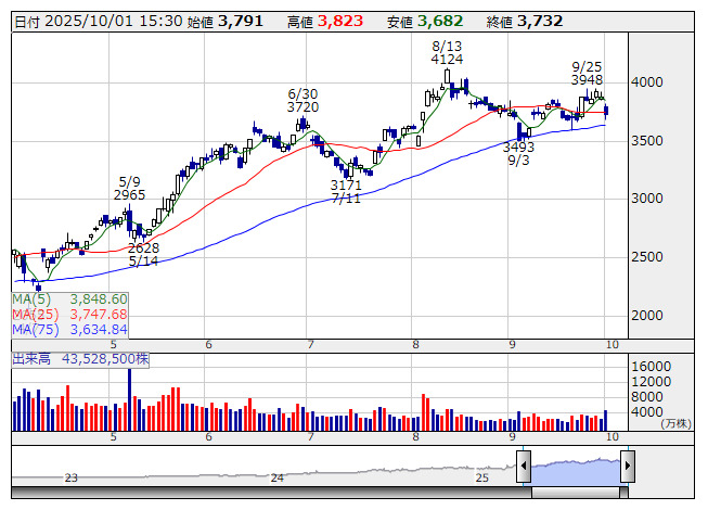 データホライゾン<3628>がストップ高。9月30日の取引終了後、26年3月期の連結業績予想について、最終利益を3億8700万円から6億2900万円へ上方修正しており、これを好感した買いが流入した。連結子会社DeSCヘルスケアのディー・エヌ・エー<2432>からの借入金について、残額の一部について債務免除を受けたことに伴い、債務免除益2億4200万円を特別利益として計上することが要因としている。なお、売上高60億円、営業利益4億円は従来見通しを据え置いている。