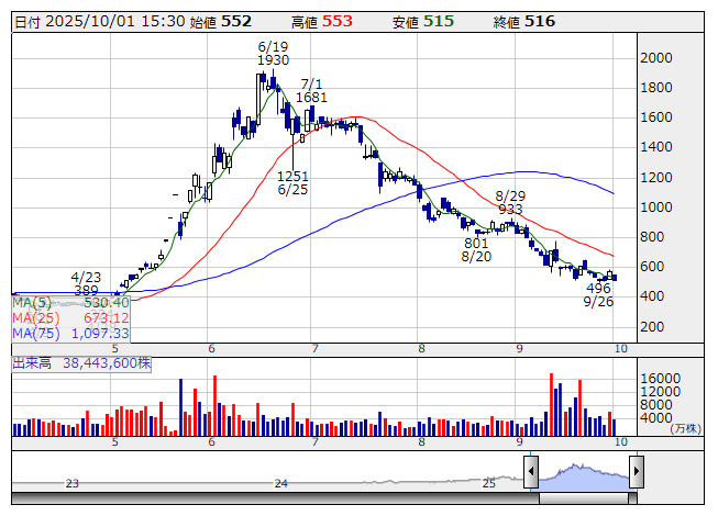 メタプラ <日足> 「株探」多機能チャートより同事業はビットコイン・トレジャリー事業全体における資本配分戦略の一環として位置づけている。あわせてメタプラはビットコインを追加購入したと開示。購入総額は916億6100万円で5268ビットコインを取得。同社の保有枚数は3万823ビットコイン(購入総額4898億7000万円)となった。