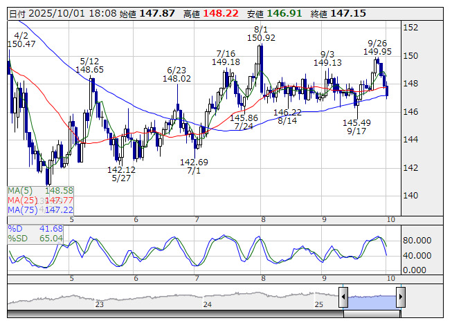 米ドル/円 <日足> Slowストキャス 「株探」多機能チャートより1日の欧米外為市場では、ドル・円は伸び悩む展開を予想する。米連邦準備制度理事会(FRB)の追加利下げ観測は一服し、ドルに買戻しが入りやすい。ただ、米国政府の一部閉鎖の懸念から、ドルは下押し圧力が続きそうだ。