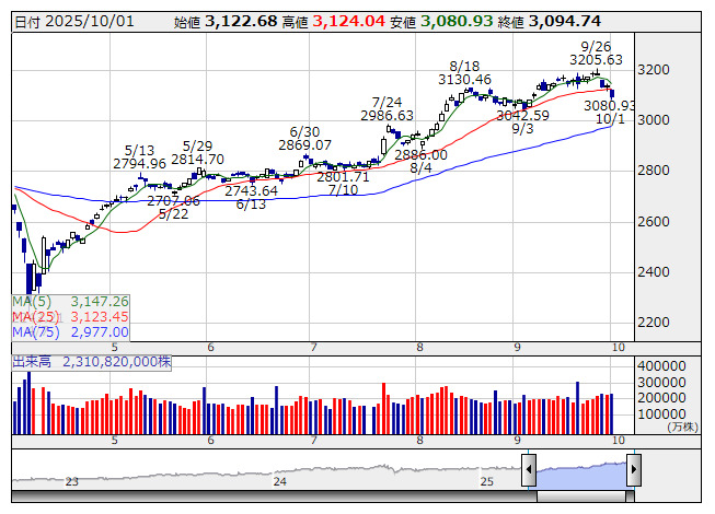 TOPIX <日足> 「株探」多機能チャートより日本取引所が公表した先物手口情報によると、10月1日のTOPIX先物期近(2025年12月限)の夜間取引(立会内・J-NETの合算)で、取引高トップはABNクリアリン証券の1万7963枚だった。