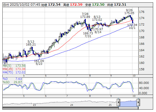 ユーロ/円 <日足> Slowストキャス 「株探」多機能チャートよりユーロ・ドルは、1.0341ドル(2017/01/03)まで下落したが、1.2537ドル(2018/02/18)まで上昇。その後、0.9536(2022/09/28)まで反落したが、2024年にかけて1.1ドル台まで戻している。ユーロ・円は英国民投票で欧州連合(EU)からの離脱が決定し、一時109円57銭(2016/06/24)まで急落。その後137円50銭(2018/2/2)まで買われたあと、長期間伸び悩んだが、日欧金利差の拡大や円安・ドル高の進行を受けて175円16銭(2024/7/10)まで上昇。ただ、その後は上げ渋っている。ユーロ圏経済の先行きについては楽観視できない状況が続いているが、米政府機関の一部閉鎖受けてユーロ買い・米ドル売りが増えていることや日本銀行による大幅追加利上げの可能性は低いと予想されているため、リスク回避的なユーロ売り・円買いがただちに拡大する可能性は低いと予想される。