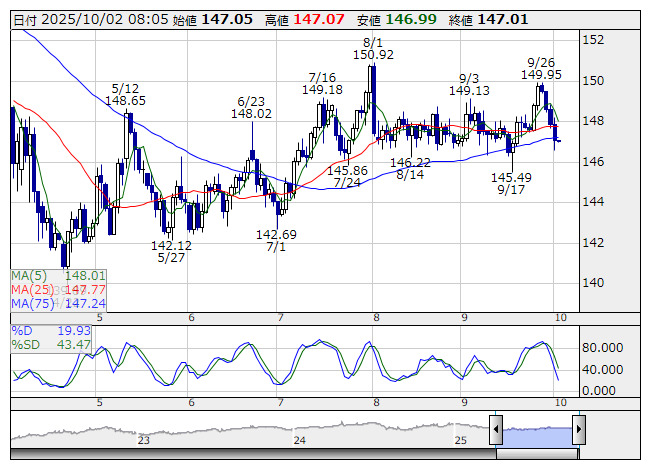 米ドル/円 <日足> Slowストキャス 「株探」多機能チャートより1日のニューヨーク外為市場でドル・円は146円59銭まで下落後、147円25銭へ反発し、147円10銭で引けた。共和党と民主党が対立し予算案が成立せず米国政府機関が閉鎖したほか、米9月ADP雇用統計が予想外の2カ月連続のマイナスに落ち込み年内の利下げを織り込むドル売りに拍車がかかった。その後、9月ISM製造業景況指数が8月から予想以上に改善、さらに、現時点で政府機関閉鎖による米国格付けへの短期的な影響はないと格付け会社フィッチが明らかにしドルは下げ止まった。