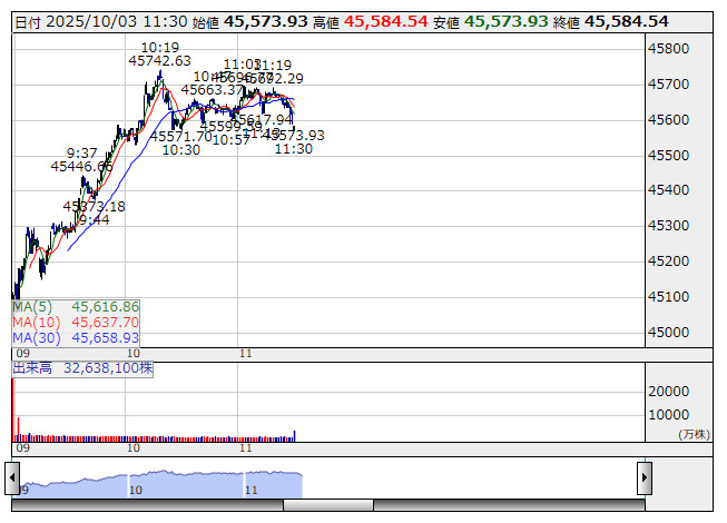 日経平均 <1分足> 「株探」多機能チャートより日経平均株価は大幅続伸。前日の米株式市場では、NYダウが78ドル高となり、ナスダック指数やS&P500種株価指数も値を上げ主要3指数がそろって最高値を更新した。米追加利下げへの期待が強くハイテク株などが上昇した。これを受けた東京市場も、日経平均株価は値を上げてスタート。午前10時過ぎには上昇幅は一時800円を超え9月25日につけた最高値(4万5754円)に迫った。ソフトバンクグループ<9984>が初の2万円台に乗せるなどAI関連の半導体関連株を中心に買いが流入した。