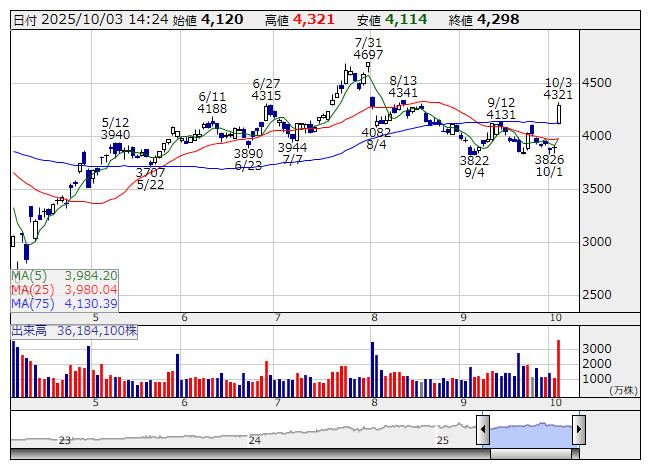 2025年10月03日14時24分 【材料】日立---大幅続伸、オープンAIと戦略的パートナーシップ締結 日立 <日足> 「株探」多機能チャートより 日立<6501>は大幅続伸。米オープンAIと戦略的パートナーシップに関する基本合意書を締結している。AI向けデータセンターの電力関連技術で提携、同社で送配電設備や空調技術を提供し、オープンAIでは電力消費を抑えながら電力を安定確保していく計画。協業の軸になるのはAIデータセンターへの送配電設備の供給となるもようで、オープンAIのデータセンター整備が業容拡大につながるとの期待感先行。 《ST》 提供:フィスコ