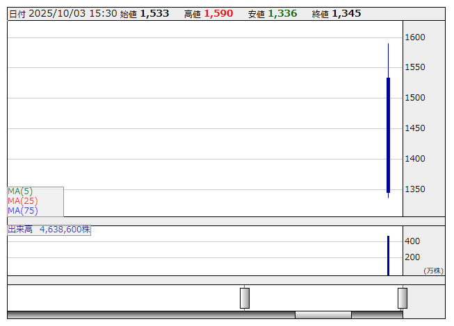 414A>は、午前9時9分に公開価格1650円を117円(7.1%)下回る1533円で初値をつけた。直後に1590円に上昇したが、その後は1300円台前半に急落。いったんは1400円台後半に持ち直す場面もあったが、後場は概ね弱含みで推移し、午後2時26分には前場の安値を下回る1336円に下落した。引けにかけては安値圏で推移し、1345円で初日の取引を終えた。