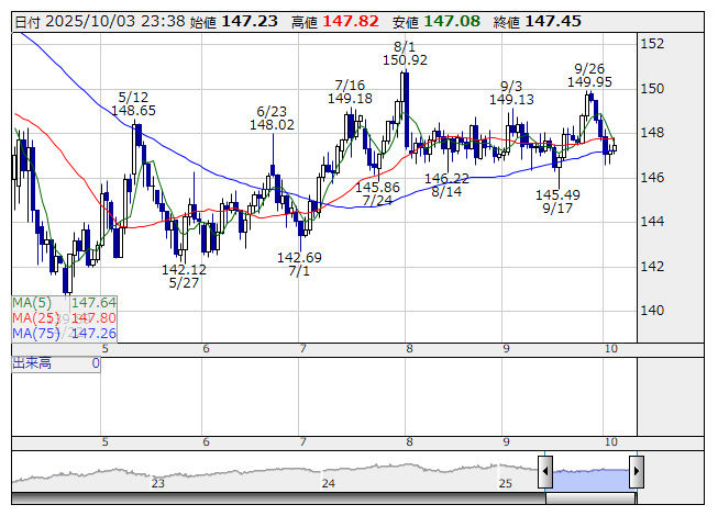 米国債相場は反落。10年債利回りは4.115%まで上昇した。米9月ISM非製造業景況指数が予想を下回りドルは売られたのち、底堅く推移。ドル・円は147円10銭へ弱含んだのち、147円50銭へ上昇した。ユーロ・ドルは1.1759ドルまで上昇後、1.1740ドルまで反落、ポンド・ドルは1.3478ドルまで上昇後、1.3462ドルまで反落した。
