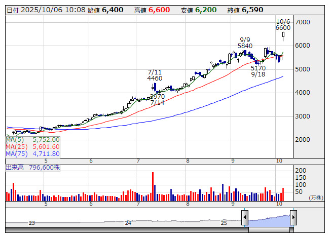 古野電 <日足> 「株探」多機能チャートより舶用事業における販売が好調に推移しており、商船向けでは、中国における造船会社の高水準な手持ち工事量を背景に建造能力の拡大が進んだ結果、納期の全体的な前倒しが発生し販売が増加。また、プレジャーボート向けでは、今期に上市した戦略商品の販売が好調だったことに加え、4月に発表された米国関税政策の影響による前倒し需要が発生し、売上高・利益を押し上げたとしている。
