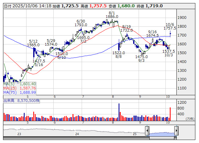 2025年10月06日14時18分 【材料】浜松ホトニク---大幅続伸、高市トレードで買いが向かう ホトニクス <日足> 「株探」多機能チャートより 浜松ホトニク<6965>は大幅続伸。高市氏の自民党新総裁選出を受けて、高市トレードの買いが優勢となっている。高市氏は核融合発電の推進に積極的とされており、同社は核融合発電で用いられるレーザーの技術などに強みを持っている。核融合発電関連ではジェイテックコーポ、助川電気、神島化学などにも買いが向かう。ほか、高市トレードでは、量子コンピュータ関連としてフィックスターズなども大幅高。 《ST》 提供:フィスコ