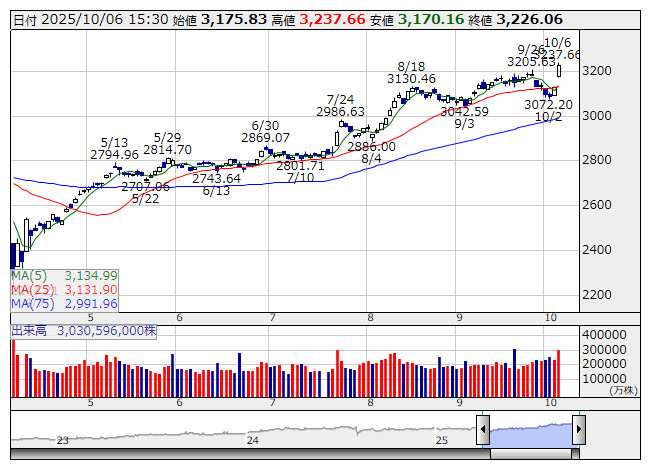 2025年10月06日15時47分 【市況】TOPIX先物:6日清算値=99.5ポイント高、3237ポイント TOPIX <日足> 「株探」多機能チャートより 6日15時45分、TOPIX先物期近2025年12月限は前週末清算値比99.5ポイント高の3237ポイントで取引を終えた。出来高は8万2881枚だった。この日のTOPIXの現物終値3226.06ポイントに対しては10.94ポイント高。 株探ニュース