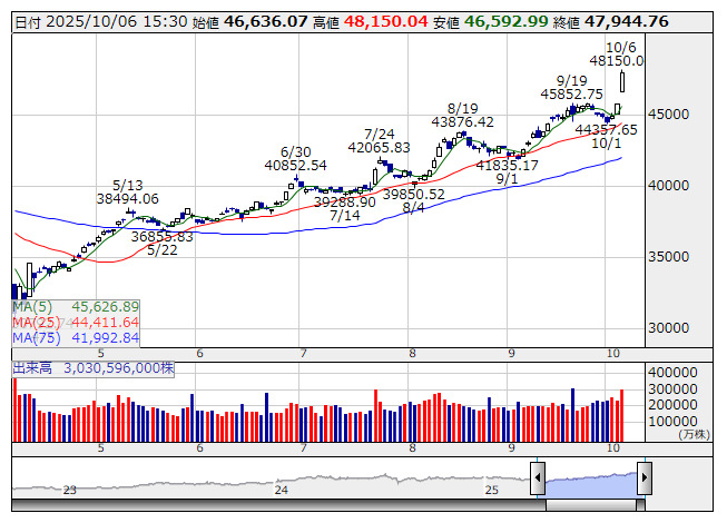【市況】【↑】日経平均 大引け| 急騰、高市氏勝利を好感し一時4万8000円台 (10月6日)