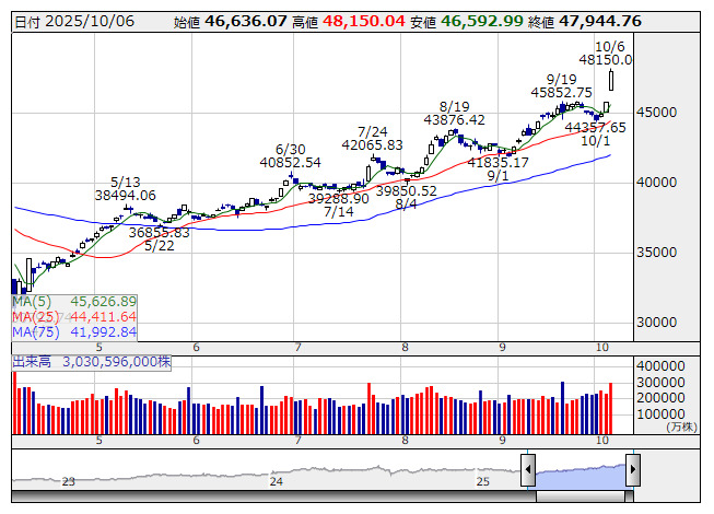 【市況】日経225先物:6日19時=160円高、4万8350円