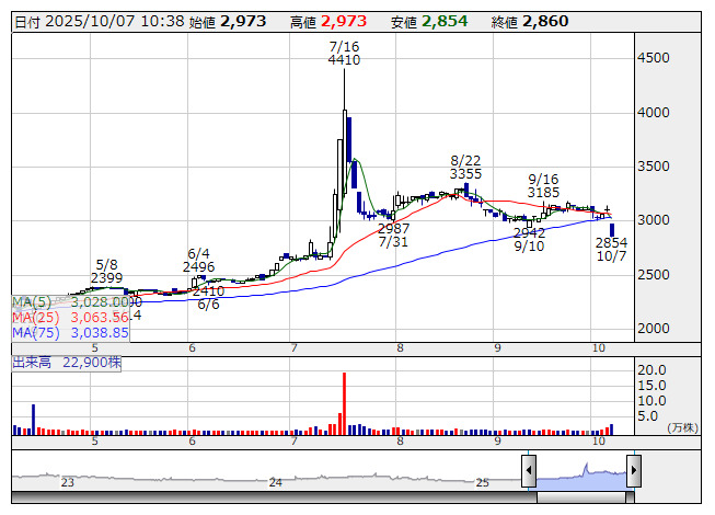 2025年10月07日10時47分 【材料】メディ一光Gが3日ぶり急反落、6~8月経常益が8%減 メディ一光G <日足> 「株探」多機能チャートより メディカル一光グループ<3353>が3日ぶりに急反落している。同社は6日の取引終了後、26年2月期第2四半期累計(3~8月)の連結決算を発表した。売上高は前年同期比18.8%増の269億3500万円、経常利益は同3.2%増の8億8000万円だった。第2四半期(6~8月)は売上高が前年同期比17.7%増の135億1200万円、経常利益が同8.0%減の3億8900万円との計算になり、直近の減益を嫌気した売りが優勢になっている。 8月中間期は営業・最終ベースでは減益だった。調剤薬局事業や不動産事業が増収増益だったものの、コスト増を受けヘルスケア事業と医薬品卸事業の営業利益が前年同期を大幅に下回った。助成金収入などが増加し、経常利益は増益で着地した。 出所:MINKABU PRESS