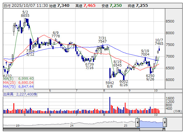 4519>は続伸。大阪大学の坂口志文特任教授が2025年のノーベル生理学・医学賞を受賞、免疫反応を抑えるブレーキ役となる「制御性T細胞」を発見したことが主な選定理由とみられる。同社は坂口氏所属の大阪大学免疫学フロンティア研究センターと包括連携契約を締結し、免疫抑制機能を高めた細胞を作る仕組みを解明してきたことで関連銘柄と位置付けられる。ただ、受賞期待は一定程度織り込まれていたこと、短期的業績インパクトが不透明なことから、買い先行後はやや伸び悩む動きに。