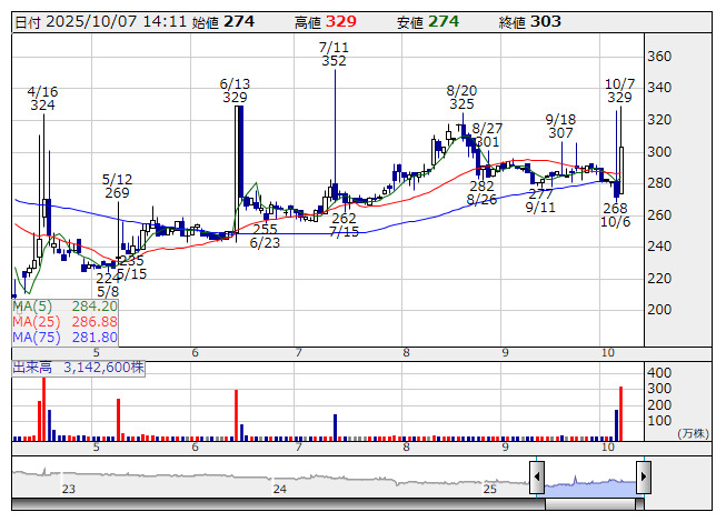 6663>は大幅反発。電子基板事業において、和歌山県が推進する新たな産業創出と地域活性化を目的としたプロジェクト「宇宙まちづくり推進事業」に参画することを決定と発表している。同社では、宇宙機器の軽量化・高機能化に貢献することを目指していくとしている。また、これを契機として宇宙分野への技術展開と事業強化を本格的に進めていくともしている。宇宙開発は高市新総裁の関連政策とされており、より期待感の高まる状況となっているもよう。