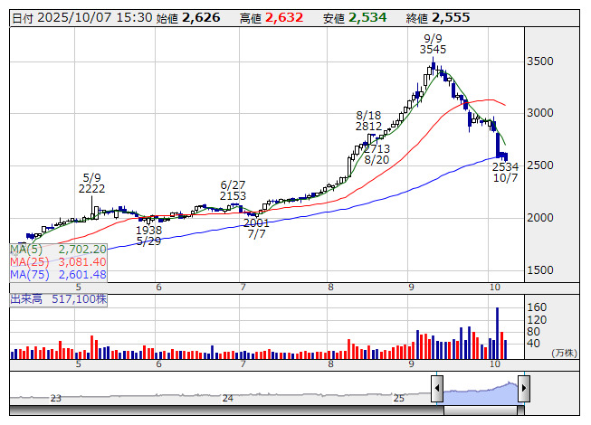 月島HD <日足> 「株探」多機能チャートより■財務省 : 10月7日受付