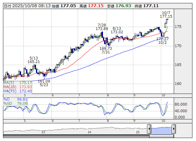 ユーロ/円 <日足> Slowストキャス 「株探」多機能チャートよりユーロ・ドルは、1.0341ドル(2017/01/03)まで下落したが、1.2537ドル(2018/02/18)まで上昇。その後、0.9536(2022/09/28)まで反落したが、2024年にかけて1.1ドル台まで戻している。ユーロ・円は英国民投票で欧州連合(EU)からの離脱が決定し、一時109円57銭(2016/06/24)まで急落。その後137円50銭(2018/2/2)まで買われたあと、長期間伸び悩んだが、日欧金利差の拡大や円安・ドル高の進行を受けて175円43銭(2024/7/11)まで上昇。その後は上げ渋っていたが、高市市の自民総裁就任を受けて177円15銭(2025/10/7)まで一段高となった。日本銀行による10月利上げ観測は後退しており、リスク回避的なユーロ売り・円買いがただちに拡大する可能性は低いと予想される。