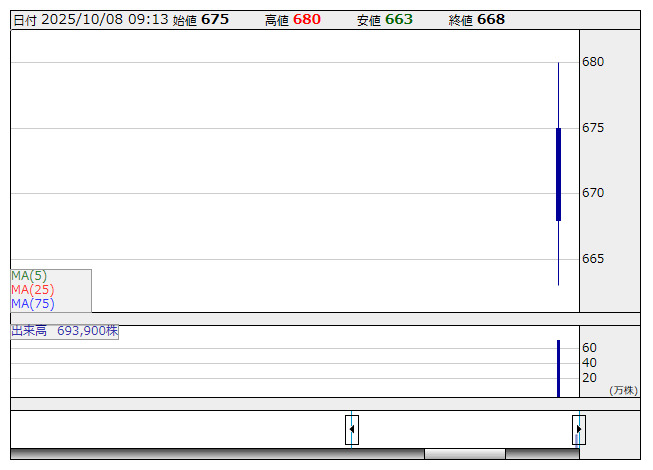 2025年10月08日09時13分 【材料】【IPO】サイプレス・ホールディングス<428A>---初値は675円(公開価格710円) サイプレス <日足> 「株探」多機能チャートより サイプレス・ホールディングス<428A>の初値は公開価格を4.9%下回る675円となった。初値形成時の出来高は42万5500株だった。 《CN》 提供:フィスコ