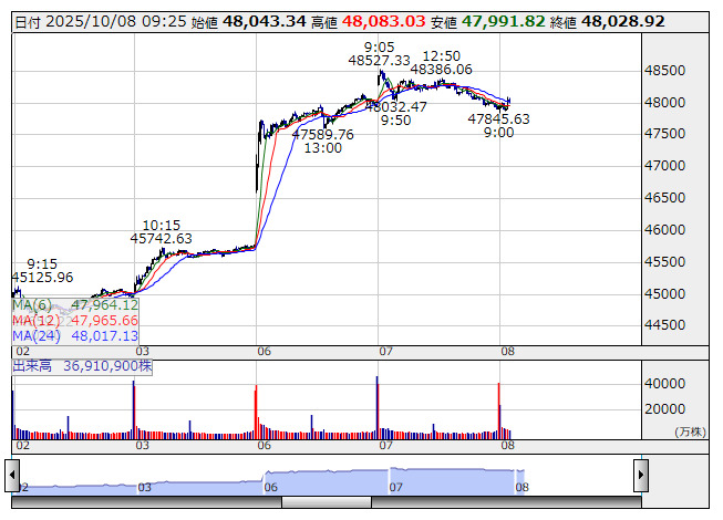 日経平均 <5分足> 「株探」多機能チャートより日経平均 : 47,925.2 (-25.66)