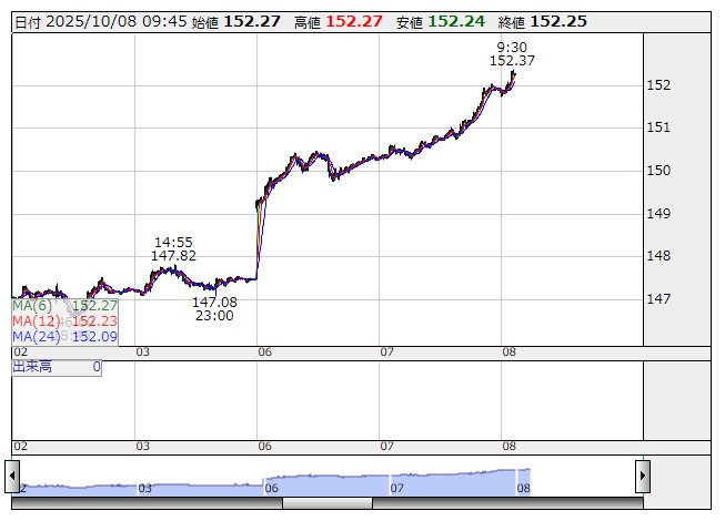 2025年10月08日09時48分 【通貨】東京為替:円キャリー取引継続、米ドル・円は152円38銭まで続伸 米ドル/円 <5分足> 「株探」多機能チャートより 8日午前の東京市場でドル・円は強含み、151円74銭から152円38銭まで上昇。ユーロ・ドルは1.0661ドルから1.1646ドルまで値下がり。ユーロ・円は最高値を更新。176円94銭から177円46銭まで値上り。 《MK》 提供:フィスコ