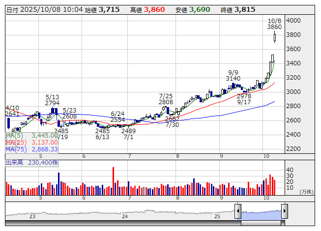 7389>は大幅高で5日続伸し、上場来高値を連日更新している。地銀を中心に投資するありあけキャピタル(東京都中央区)が7日の取引終了後に関東財務局へ大量保有報告書を提出した。新たにあいちFGの株式について5%を超えて保有していることが明らかになり、需給思惑的な買いが入っている。大量保有報告書によると、ありあけキャピタルの保有割合は5.06%。報告義務発生日は9月30日。保有目的は純投資と「状況に応じて経営陣への助言、重要提案行為等を行うこと」としている。