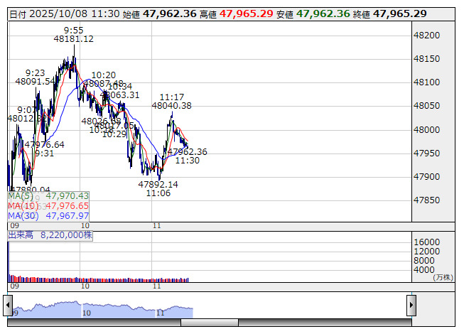 日経平均 <1分足> 「株探」多機能チャートよりきょう前場の東京株式市場は強弱観対立のなか、日経平均は総じてプラス圏で推移したものの上値の重さも意識された。前日の米国株市場ではNYダウ、ナスダック総合株価指数ともに朝方こそ高く始まったが、すぐに値を消す展開でいずれも安くなった。東京市場でも日経平均はここ過熱気味に上昇していたことから、きょうは米株安を受けて利益確定売りが観測される展開に。ただ、AIや半導体関連などに売りが目立った一方で、防衛関連や銀行株などが強さを発揮し全体指数を支えた。外国為替市場で急速に円安が進んでいることも足もとでプラスに作用したもようだ。