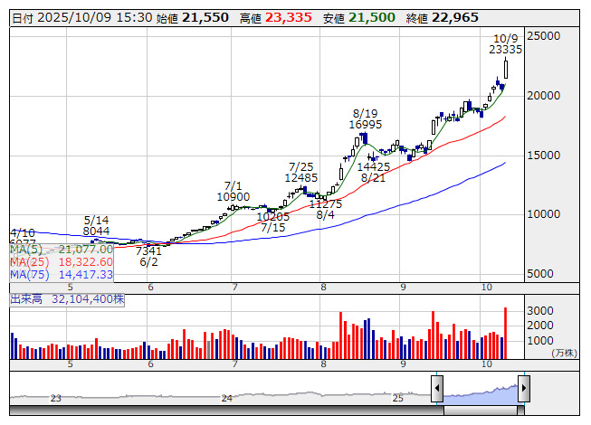 FFRIセキュリティ<3692>が大幅高で5連騰となり2015年12月以来約10年ぶりの高値を更新した。サイバーセキュリティー専業で標的型攻撃に特化した純国産ソフト開発で強みを持ち、高市トレードではシンボルストックの一角を担う。世界トップレベルのセキュリティーエンジニアも確保し、ネット空間における国家安全保障で活躍が期待されている。業績も大幅増収増益基調を継続中で、26年3月期はトップライン、利益ともに連続過去最高更新が見込まれている。注目されるのは株式需給面であり直近3日現在の信用倍率が1.30倍、貸借倍率は0.13倍と売り長状態。更に貸株市場を通じた空売りが高水準に積み上がり、踏み上げ相場に発展する可能性を内包している。そうしたなか8日付で貸株規制が入り、現引き停止及び新規売り停止となっている。