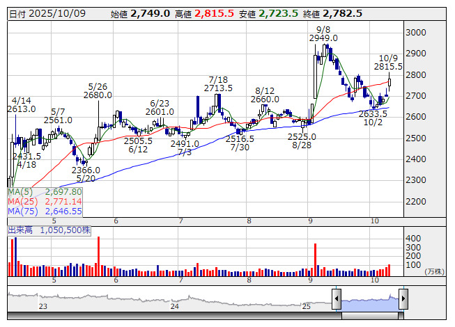 ウエルシア <日足> 「株探」多機能チャートより銘柄名<コード>9日終値⇒前日比