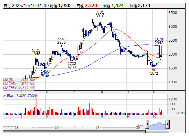 <4587> ペプチドリーム 1694 +42 ( +2.5%) 1631.4 1630.4