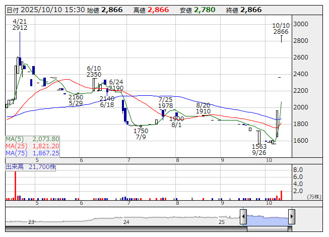 オーネックス <日足> 「株探」多機能チャートより個別ではオーネックス<5987>、エリアクエスト<8912>がストップ高。カネコ種苗<1376>、コロンビア・ワークス<146A>、クオンタムソリューションズ<2338>、アルバイトタイムス<2341>、ケア21<2373>など27銘柄は年初来高値を更新。サン電子<6736>、ヒーハイスト<6433>、フジタコーポレーション<3370>、大東港運<9367>、トレードワークス<3997>は値上がり率上位に買われた。