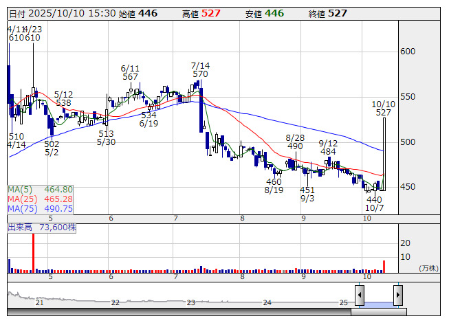 インタファク <日足> 「株探」多機能チャートより個別ではインターファクトリー<4057>、セルシード<7776>がストップ高。レナサイエンス<4889>、CaSy<9215>は一時ストップ高と値を飛ばした。スタジオアタオ<3550>、FFRIセキュリティ<3692>、ムービン・ストラテジック・キャリア<421A>、NANO MRNA<4571>、オンコリスバイオファーマ<4588>など9銘柄は年初来高値を更新。AppBank<6177>、インフォメティス<281A>、ABEJA<5574>、Birdman<7063>、リグア<7090>は値上がり率上位に買われた。
