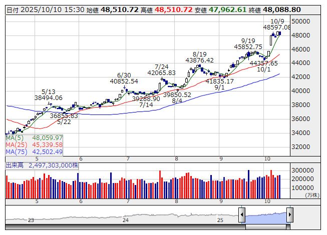 日経平均 <日足> 「株探」多機能チャートよりPTS市場全体、および日経平均構成銘柄の10日終値比の上昇率・下落率ランキングは以下のとおり。