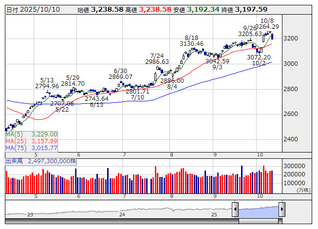 2025年10月14日08時46分 【市況】TOPIX先物:14日寄り付き=25ポイント安、3149ポイント TOPIX <日足> 「株探」多機能チャートより 14日8時45分、TOPIX先物期近2025年12月限は前週末清算値比25ポイント安の3149ポイントで寄り付いた。前週末のTOPIXの現物終値3197.59ポイントに対しては48.59ポイント安。 株探ニュース