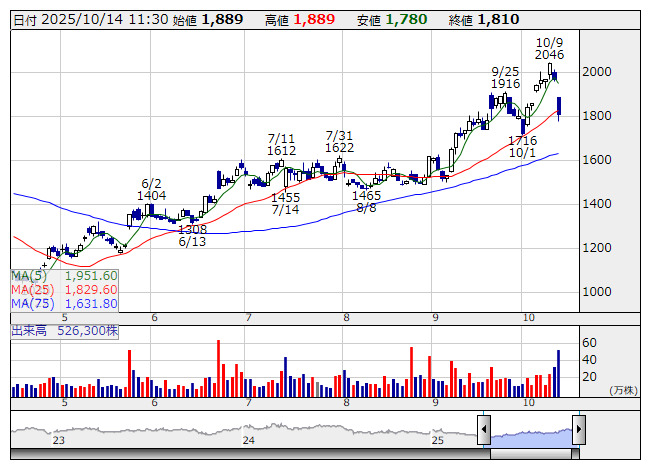 大幅続落。先週末に25年8月期の決算を発表、営業利益は21億円で従来計画の19億円を上振れ着地。前期単独実績は1.6億円であった。26年8月期は28億円で同33.1%増の見通し。消耗品受注の好調推移や、KMACの連結化フル寄与を見込んでいる。年間配当金も前期比16円増の56円を計画。ただ、M&A効果が25年8月期は5カ月間でセグメント利益385百万円の効果だったことから、今期大幅増益のインパクトは限定的なもよう。