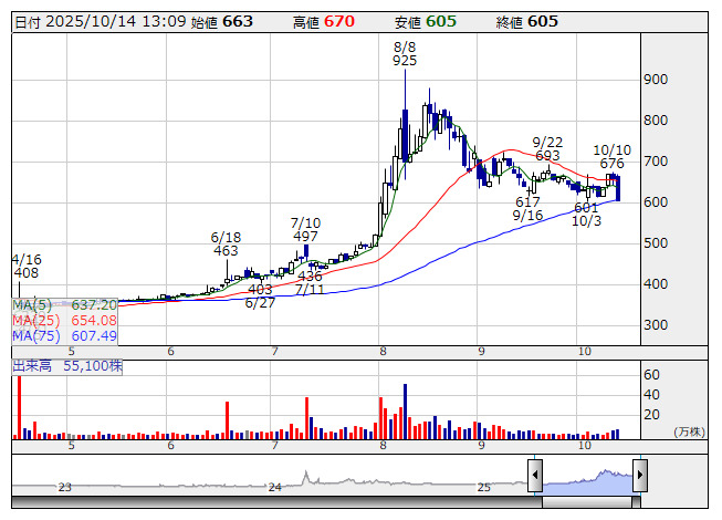 続落。25年8月期の売上高は31.53億円(前期比105.9%)、経常利益は0.52億円(同310.7%)と大幅増収増益だった。前事業年度での黒字転換を経て、各種の取り組みが具体的な成果として確認できるステージへ移行し、オペレーティングレバレッジが発揮されやすい収益構造を背景に生産性向上が顕著に表れたとしている。またあわせて、25年10月31日を基準日として1株につき2株の割合での株式分割も発表した。ただ、営業利益が計画を下振れたことなどを嫌気して売りに押されている。
