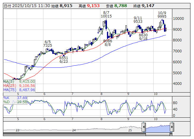 <5801> 古河電気工業 9147 +318 ( +3.6%) 9106.6