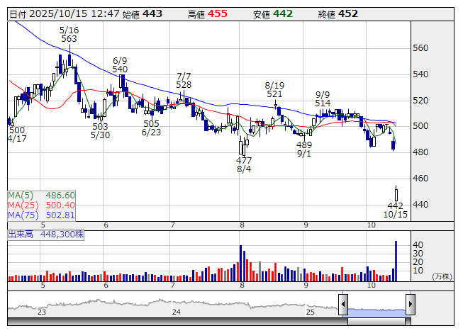 3835>は大幅続落。前日に業績予想の下方修正を発表している。上半期営業利益は従来予想の6.6億円から5.4億円、前年同期比22.8%減に、通期では19.7億円から13.3億円、前期比23.4%減にそれぞれ引き下げ。カスタマイズ案件への開発リソース投入が増加し、新規開拓のための活動停滞で、新規案件の獲得ペースが想定を下回る状況となったもよう。100万株、5億円上限の自社株買いを発表しているが、業績下振れをマイナス視する動きが優勢。
