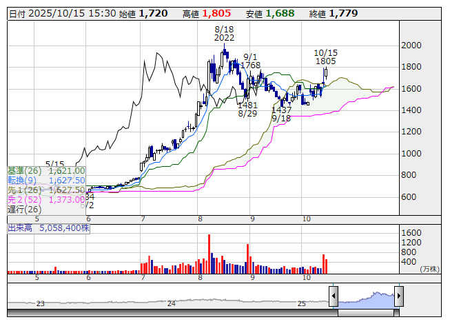 東洋エンジ <日足> 一目均衡表 「株探」多機能チャートより●一目均衡表【3役好転】銘柄(市場人気順) ★強い上昇トレンドに入った可能性が高い銘柄