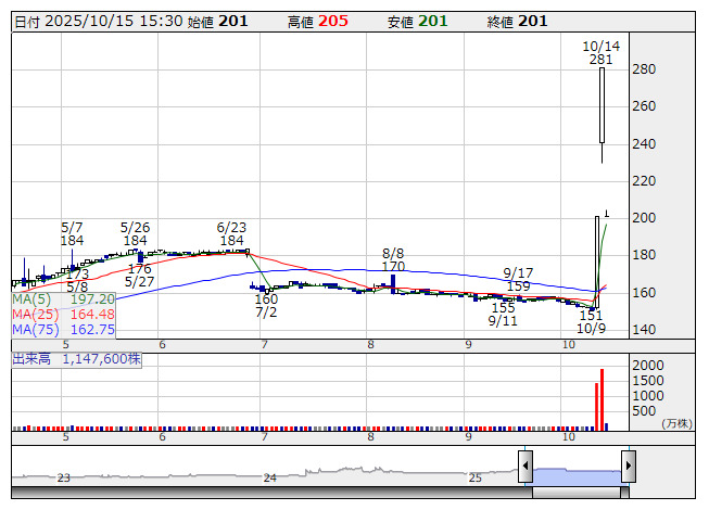 エリアクエス <日足> 「株探」多機能チャートより●本日の株価下落率ランキング【ベスト50】