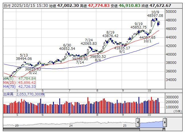 日経平均 <日足> 「株探」多機能チャートより日本取引所が公表した先物手口情報によると、10月15日の日経225先物期近(2025年12月限)の夜間取引(立会内・J-NETの合算)で、取引高トップはABNクリアリン証券の1万2709枚だった。