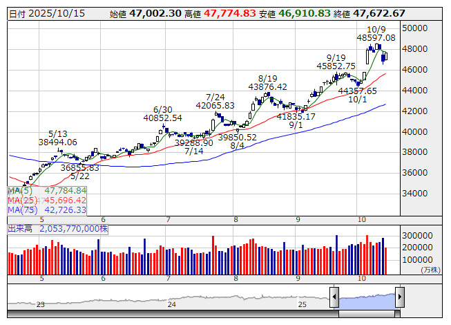 2025年10月16日07時47分 【市況】シカゴ日経平均先物 大取終値比 190円高 (10月15日) 日経平均 <日足> 「株探」多機能チャートよりシカゴ日経225先物 (円建て) 48000 ( +190 ) シカゴ日経225先物 (ドル建て) 48100 ( +290 ) ※( )は大阪取引所終値比 株探ニュース