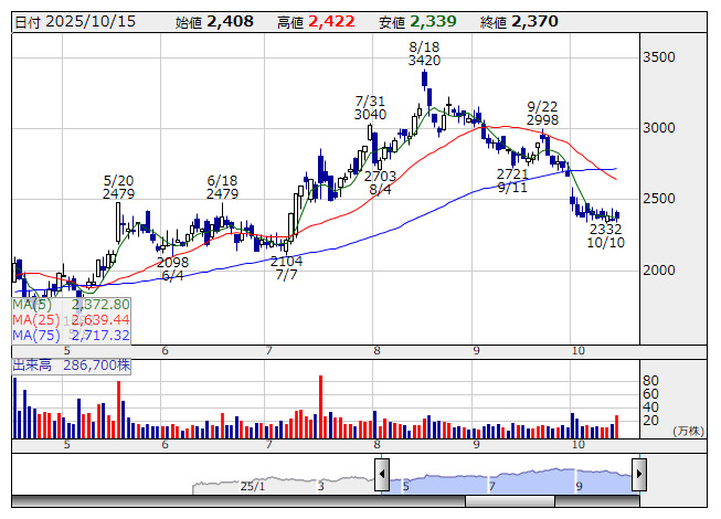 リップス <373A> 2,575 -700 (-21.4%) 436,100 (112,295) 66,500 ( 17,123)