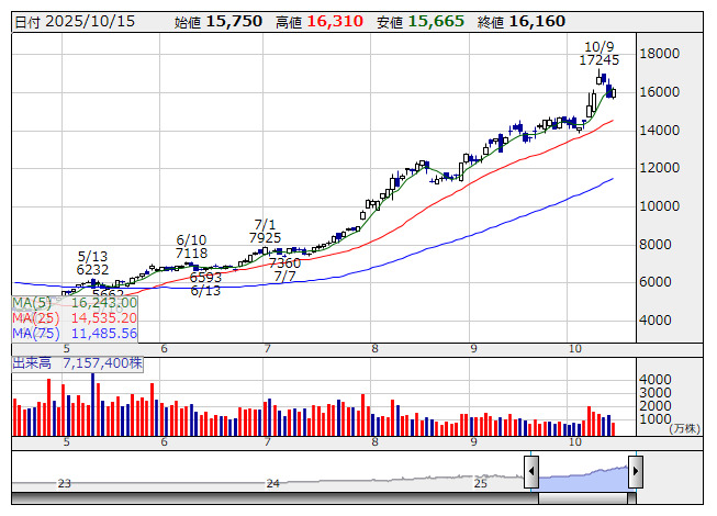 フジクラ <日足> 「株探」多機能チャートより(東証プライム上場 1612 銘柄対象)