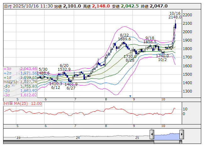 イオン <日足> ボリンジャー/カイリ率 「株探」多機能チャートより●株価が+3σを上回った銘柄(市場人気順) ★株価の上げ足が速過ぎ、売りが出やすい銘柄