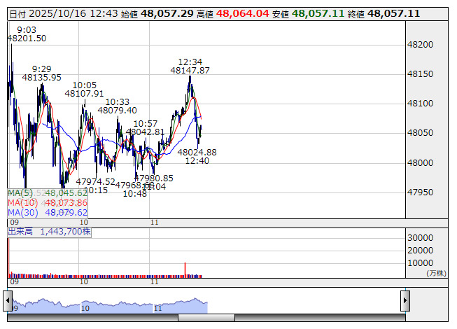 米株式市場の動向を横目に、16日の日経平均は434.77円高の48107.44円と続伸して取引を開始した。為替ではドル安・円高の一服感が意識され、輸出関連銘柄には下押し圧力も出にくい地合いとなった。前場序盤から中盤にかけては売買が交錯したものの、自民党と日本維新の会が首相指名選挙での協力の可能性の報道などを受け次第に買いが優勢となり、プラス圏を維持して上昇幅を拡大した。需給面では、押し目買いや利益確定売りが混在しながらも、買いの厚みを確認する動きが目立った。