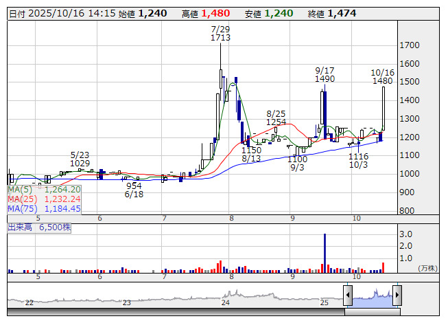 4250>が一時ストップ高の水準となる前営業日比300円高の1480円に買われる場面があった。同社は15日の取引終了後、25年11月期第3四半期累計(24年12月~25年8月)の連結決算の発表にあわせ、配当予想の増額修正と株式分割の実施について開示し、材料視されたようだ。今期の期末配当予想を従来の見通しから5円増額して20円とする。年間配当予想は35円(前期比25円増配)となる。また、11月30日を基準日として12月1日付で1株を2株に分割する。第3四半期累計の売上高は前年同期比14.2%増の12億6100万円、営業損益は9900万円の黒字(前年同期は300万円の赤字)となった。