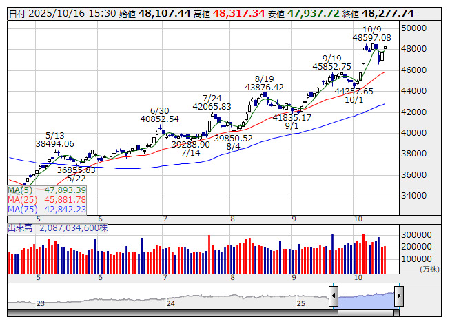 日経平均 <日足> 「株探」多機能チャートより日本取引所が公表した先物手口情報によると、10月16日の日経225先物期近(2025年12月限)の日中取引(立会内・J-NETの合算)で、取引高トップはABNクリアリン証券の1万7842枚だった。