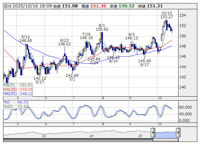 米ドル/円 <日足> Slowストキャス 「株探」多機能チャートより欧州市場でドル・円は底堅く推移し、151円05銭から151円28銭まで小幅に値を上げた。米金利安を背景にドル売りに振れ、ユーロや豪ドルなど主要通貨は対ドルで小高く推移する。一方、日本の政治情勢をにらんだ円売りも進み、クロス円も上昇基調。