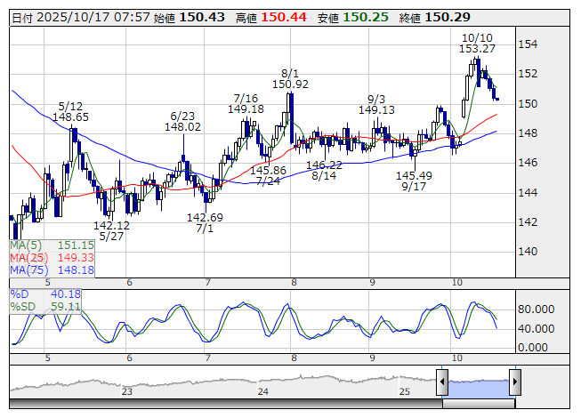 米ドル/円 <日足> Slowストキャス 「株探」多機能チャートより16日のドル・円は、東京市場では150円51銭から151円38銭まで反発。欧米市場では151円40銭まで買われた後、150円21銭まで反落し、150円44銭で取引終了。本日17日のドル・円は主に150円台で推移か。米長期金利の低下を意識してリスク選好的な円売りは抑制される可能性がある。