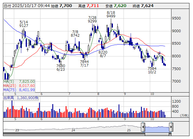 リクルート <日足> 「株探」多機能チャートより自社株取得は東京証券取引所における市場買い付け及び自己株式立会外買付取引(ToSTNeT-3)で実施する。リクルートは更に、ToSTNeT-3において自社株150万株(自己株式を除く発行済み株式総数の0.11%)の買い付けの委託を17日に実施すると発表。東証の自己株式立会外買付取引情報によると、17日に1株7646円で111万1100株の買い付けを行った。